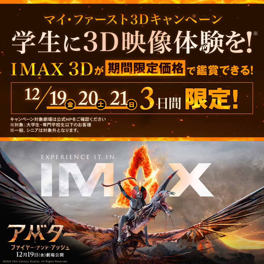 12/19(金)~12/21(日)の3日間限定で、大学生以下のお客様に限り、『アバター:ファイヤー・アンド・アッシュ』IMAX3Dを、IMAX2D料金で鑑賞いただけます。